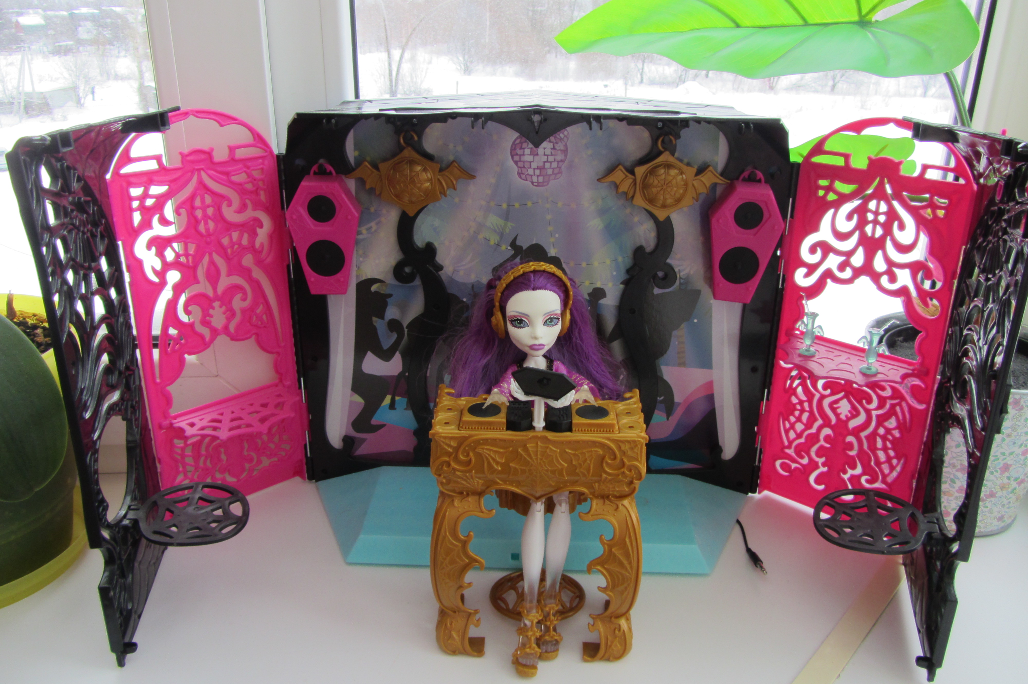 В набор входит сцена, пульт диджея, стул, 2 колонки, стенка с барной стойкой и стенка с откидным сиденьем, дополнительные аксессуары, а также кукла Спектра Вондергейст.